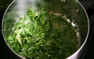 Ajoutez lestragon et le cresson dans la cocotte. Ajoutez ensuite le cube de bouillon de légumes et mouillez à hauteur.